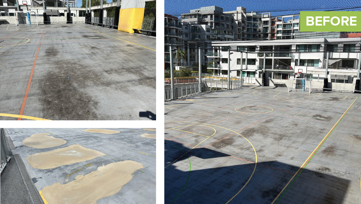 The multisport surface at Ultimo Primary School was in dire need of renovation. The project began by patching bird baths and low areas